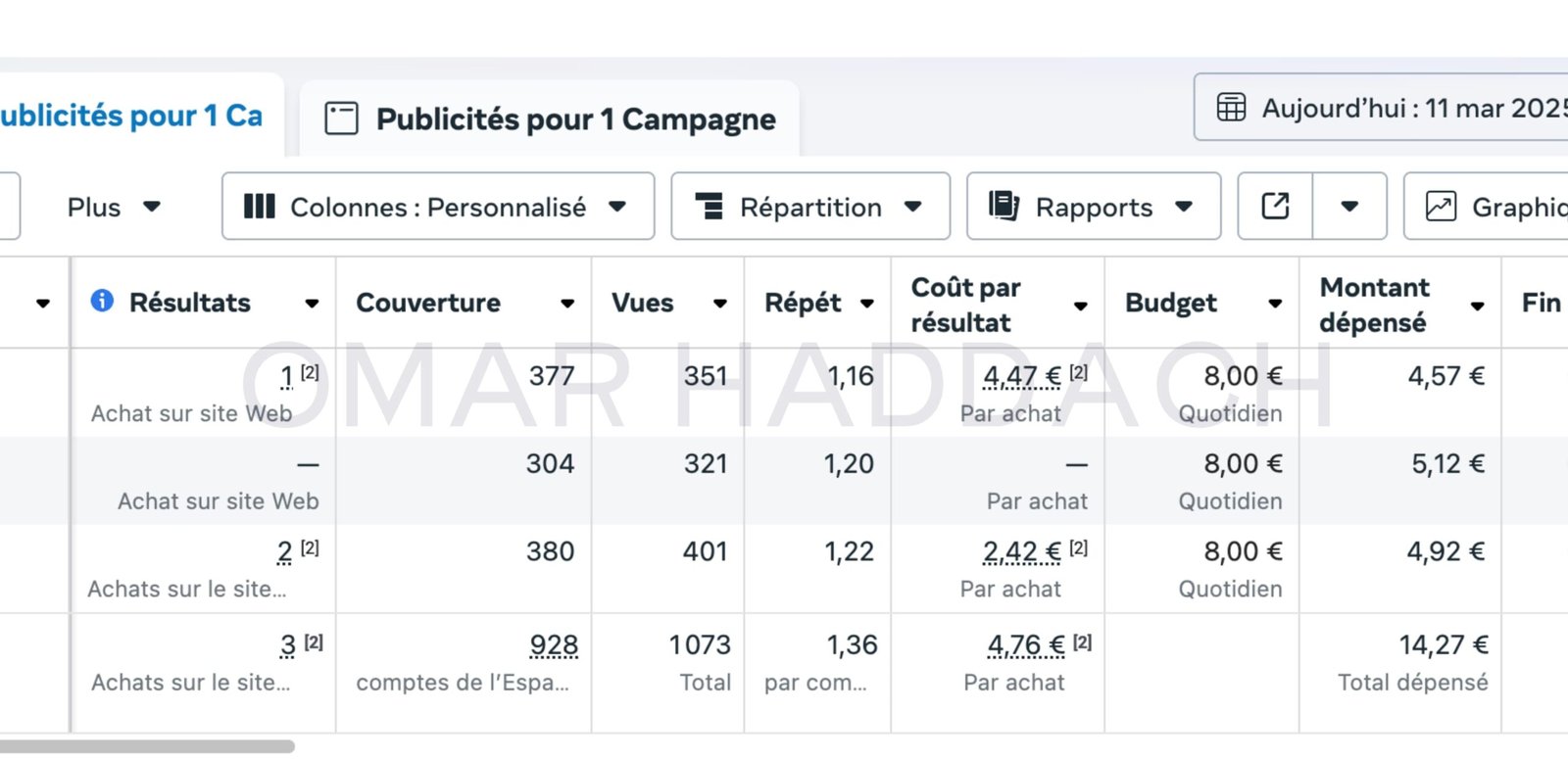 Mise en œuvre d’une stratégie de budget progressive : phase test, scaling des campagnes les plus rentables, réallocation entre notoriété, trafic et conversion.